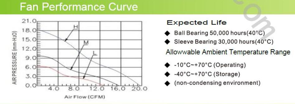 Model | Bearing Type | Rated Voltage | Operating Voltage | Input Current | Input Power | Speed | Max Air Flow | Max Static Pressure | Noise | Weight |