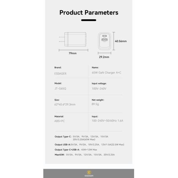 Product Name | ESSAGER JT-G65Q Series 65W Portable Fast Charger for Android Phone