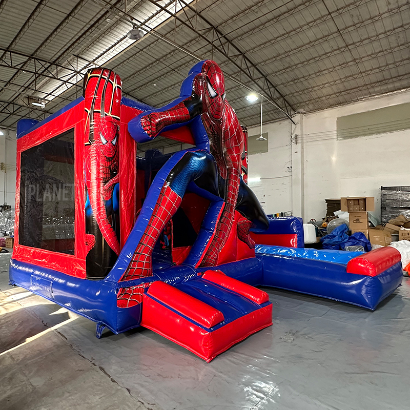 The inflatable jumping castle slide is made from durable PVC tarpaulin materials, ensuring safety and longevity. Ideal for birthday parties, events, and play areas, it provides hours of fun and physical activity, capturing the imagination of young Spider-Man fans.